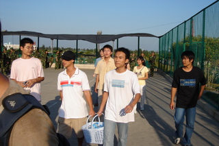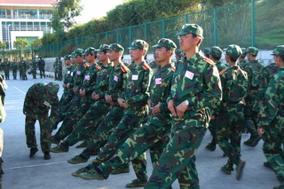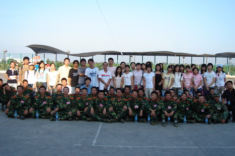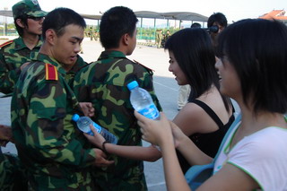 老师和05级同学首先向教官连日来的辛苦训练致以崇高的敬意和由衷的感谢,教官介绍说,今年的军训任务较为繁重,但严字当头,军训还是收到了明显效果。接着,老师和05级学长向06级同学送上了全系师生的中秋和国庆祝福,并勉励他们克服困难,不畏艰苦,认真参训,并总结经验,把军训的精神和成果带到以后的学习工作中去。