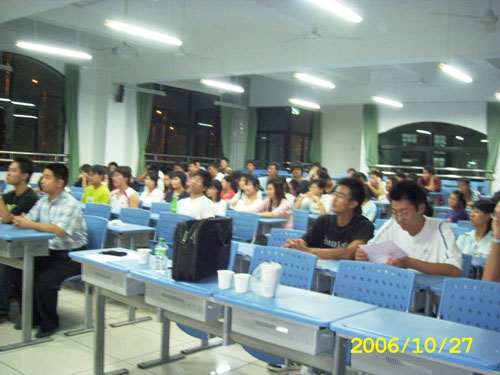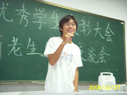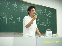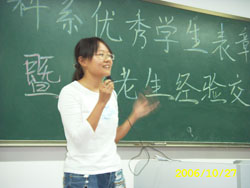 接着,大会进入新老生经验交流时间,06级学弟学妹提出了很多珍贵的问题,包括具体课程学习、日常时间安排、考研等,李志慧、周娜芝、马聪、李懿、赵颖、董莹莹、王炜、赵健、李婵娟、阎正坤、赵越、牟蕊等05级同学纷纷上台畅谈自己的学习经验,还介绍了数学、英语、环境科学、环境工程、物理、计算机C语言等具体课程的学习方法。