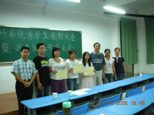 大会首先进行2005-2006学年优秀学生的表彰活动,今年我系共29人次获得一、二、三等奖奖学金以及优秀三好学生、三好学生、优秀学生干部、军训优秀学员等荣誉称号,卢昌义主任、高海燕老师、周亮老师、黄韵京老师、黄强老师分别为获奖同学颁奖并合影留念。