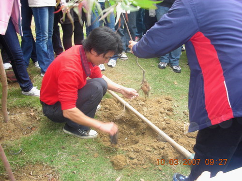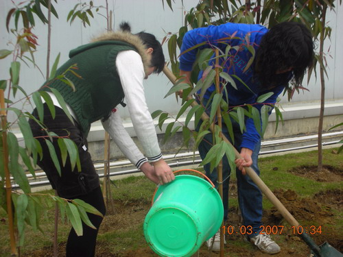 紧接着,在林业工人邱师傅介绍和示范了种植的基本过程之后,同学们都迫不及待地想要亲自尝试一番,在环协几位骨干有条不紊的组织和分配下,同学们被分成若干组并配有铁锹、铲子等工具,植树活动正式开始。一部分同学负责种植巨尾桉小苗,一部分同学负责把去年种下的巨尾桉移植到空阔地,松土、挖坑、放置树苗、填土、固定、浇水,一番热火朝天的景象过后,同学们大多汗流浃背看着自己的劳动成果,欢声笑语合影留念,初次植树趣义兼具,绿化校园你我携手,活动气氛达到最高点。