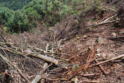 大片原生木横七竖八地倒在山坡上,其中不少树皮都被剥了