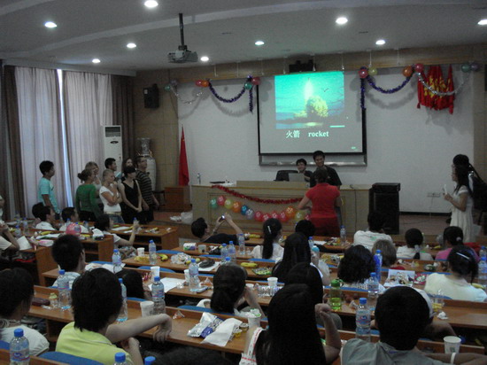轻松的游戏互动时间更是为大家带来了不少欢乐,在互动猜图游戏中,由瑞典留学生看图讲述,我们根据讲述猜出单词,一讲一猜大家配合默契,表现出众。而老师们也不甘示弱,在之后的互动猜成语游戏中,运用动作形象生动的表演引来了阵阵掌声和欢笑。