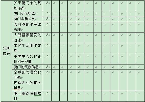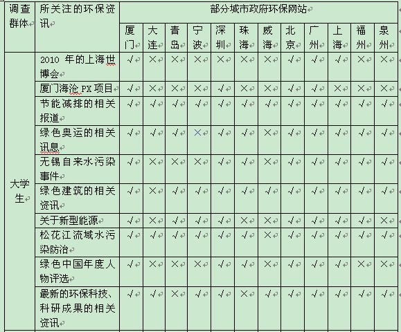 (“√”可查阅到所需信息,“×”搜索不到所要信息,本市新闻仅在厦门环境在线上做调查)