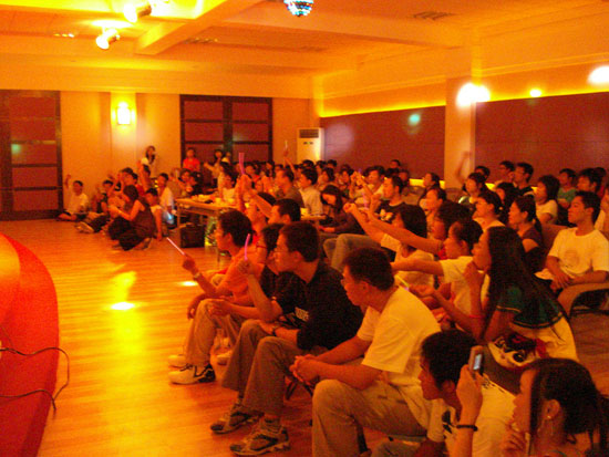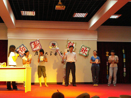 晚会的游戏环节老师与同学们共同参与,气氛愉快融洽。在“两人三足”的游戏中,我们将两个人的相邻脚用绳子绑住,在舞台上比赛。第一轮在三组同学间进行争夺;第二轮黄强和胡娟老师也组成一组和学生们一较高下,可惜不敌。最终两组的第一名再次竞逐,由06级的赵亮和沈斌颖同学胜出,胜者有精美的小礼品赠送,而输的人则是吃芥末夹心面包以示惩罚。