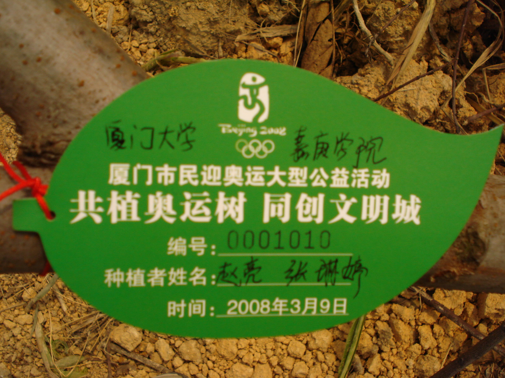 3月9号那天风和日丽,当我们到达时西山门的广场上已经人山人海,皆为植奥运树而来。在山脚下可以看见不远处的山腰上用不同灌木设计成的奥运五环,我们心情煞是激动,因为我们即将在这五环旁边的D区种植,大伙儿两或三人一组领取铁锹、铲子、水桶等工具后便沿着崎岖的山路奔向我们的目的地。我和赵亮同学一组,有了去年在学校生化大楼前的空地的种植经验后,我们相当娴熟地挖坑、放置树苗、填土、扶直固定、踩实后再提水浇树,最后种下了三棵小树苗,在它们的“身份证”上写下我们的姓名,据说过后管理人员会将它们换成铁板贴在树干上,我们内心相当有成就感。我们尽情地挥洒着汗水,植树的同时也埋下了我们对北京奥运的祝福,贫瘠的山坡因为有了我们这一群人热火朝天的奋斗而显得特有朝气。
