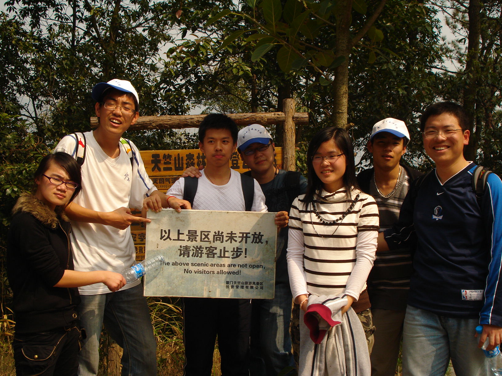 当天植完树后吃过自备的午餐,我们8个大二的同学自行组成队,进入到天竺山森林公园里去感受大自然的拥抱。看着鸳鸯溪水潺潺流过那奇头怪石,我又按奈不住自己爱戏水的天性,在石头上蹦来跳去的,兴奋得像快乐的小猴子。沿着溪水上游旁边的石阶往上走,当时没有注意到旁边写着“止步”的标示牌,我们便开始了我们的“长征路途”。我一路上东张西望,见到奇花异草便疯狂地拍照,都忘了我们一直在爬坡,折腾了好几个峰回路转还未见到一些景区或可以免费乘坐览车的大道,也不见其他游客,台阶两旁的垃圾筒里也无食品垃圾,只是覆盖着些枯黄的落叶,在深山里手机又收不到信号,大家难免有些崩溃。休息了一会儿继续赶路,生怕来不及走出去和大队伍联系,我们团结互助,互相鼓励庆幸还好是一群人,比较不会无聊,如果是一两个人的话肯定会有莫大的恐惧感,而且更加危险了。