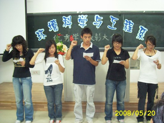 “为把自己锻炼成为政治合格、纪律严明、立场坚定、具有卓越管理能力的当代大学生,创建和谐、团结的环境科学与工程系这个大家庭,争做文明主人。我们不退缩,不彷徨,让我们燃起青春的烈火,迸发出年轻的激情,面对老师和同学立下我们的誓言,请举起右手: