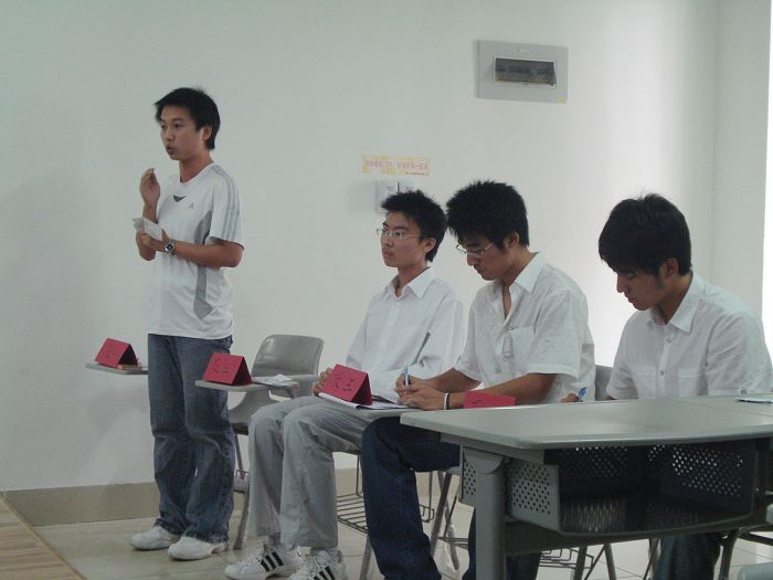 11月26日中午,“厦教留学”杯嘉庚学院辩论赛首轮淘汰赛在公共教学楼激烈展开,由我系07级的刘鑫同学担任一辩手和机电系的其他三位男同学组成的理工二队首次迎战中文系的四位巾帼,是场典型的文理对抗的辩论赛,可谓是“一场男人与女人的战争”评委老师当时如是说,此场无硝烟的战争于304教室拉开战线。