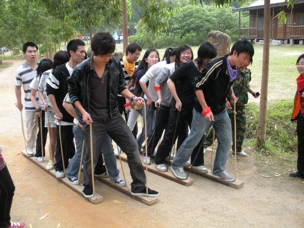 在安置好行装之后,接下来就是游戏活动环节。游戏种类繁多,有“进化论”(不进则退)、“梅花桩”(团队沟通)、“盲龙阵”(领导统御)等。在教练的指引下,同学们尝试了很多有意义、有挑战性的游戏。最让我们印象深刻的是“齐头并进”。游戏形式是要分4组,每组8个人,队员的脚踩在一块长木板上,同时手抓着固定在木板上的绳子,拉着绳子带动木板前进,最先到达终点的队就是冠军。其他三支队伍都很快到达终点线,最后一支队伍虽然落后,但是他们组仍然坚持到最后,到达终点,这充分证明了“坚持就是胜利”。