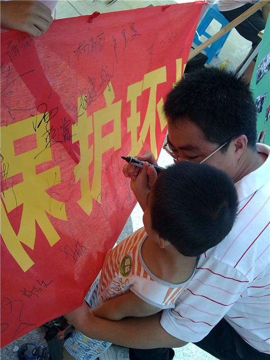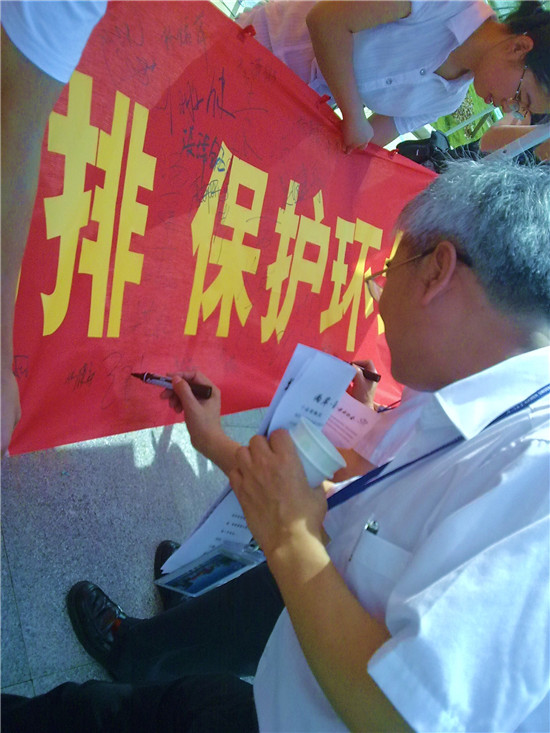 王院长在"节能减排,保护环境"的横幅上签名