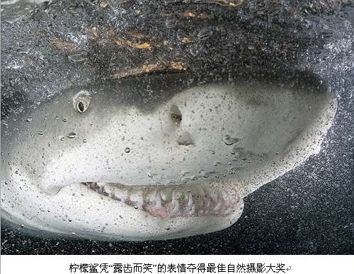 据香港《大公报》三十一日援引外电报道,一条柠檬鲨对着镜头“露齿而笑”的大特写从二万多张照片脱颖而出,夺得二○○八年度“温德兰德-史密斯-赖斯国际最佳自然摄影大奖”海洋组冠军。