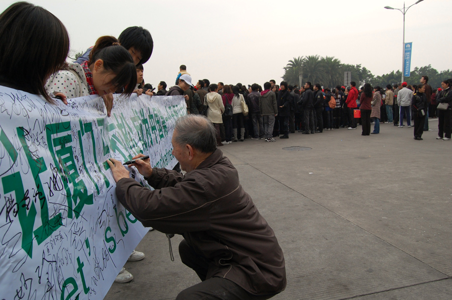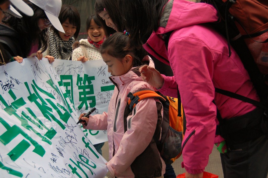 当第一个参赛者经过志愿者点时,我们所有的志愿者也同观众们一样沸腾了起来,大家一起为参赛者们呐喊助威。由于责任在身,志愿者们很快都回到了自己的岗位,分别有5、6个同学轮番拉着横幅请路过的观众们在上面签名,其中不乏满头银丝的老爷爷和稚气未脱的小孩,经过志愿者的说明之后都义不容辞的签上了名字。渐渐地横幅上遍布了名字,即使如此观众们依旧热情不减。