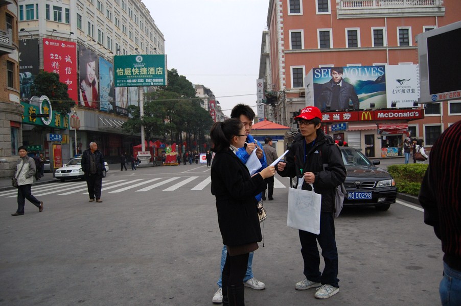 8点整马拉松正式开跑,我们的志愿者也开始行动起来。11名志愿者拉起了“让厦门马拉松成为中国第一个无烟马拉松”的横幅走向中山路,环协会长袁冶与办公室主任周琦走在横幅的前面向感到好奇的群众们解释我们当天的活动,并邀请他们为响应无烟马拉松而在横幅上签下自己的大名。