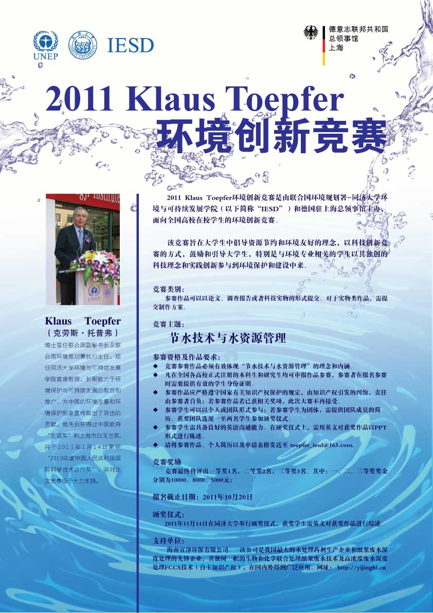 2011 Klaus Toepfer环境创新竞赛是由联合国环境规划署-同济大学环境与可持续发展学院(以下简称“IESD”)和德国驻上海总领事馆主办,面向全国高校在校学生的环境创新竞赛。该竞赛旨在大学生中倡导资源节约和环境友好的理念,以科技创新竞赛的方式,鼓励和引导大学生。