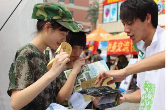 这次环境保护协会还特地为纳新制作了宣传小折页,正面上是环境保护协会品牌活动照片和简介,背面是一张校园地图和植物花卉的图片,邀请大家按图索骥发现校园的美丽。今年的宣传方式更趋于多样化,吸引了不少同学前来咨询和报名。环境保护协会的干部们也在尽力地回答新生们的咨询,并向他们介绍环境保护协会所举办过的活动,使他们对环境保护的概念不再停留在废品回收利用上,而是将其利用于生活中的小事,或者是从中寻找快乐,真正地唤起同学们保护环境的意念。