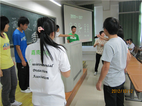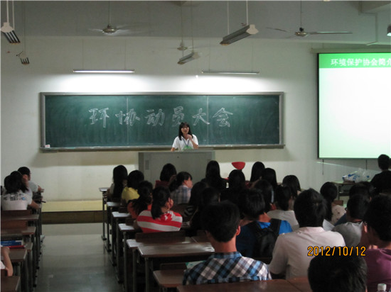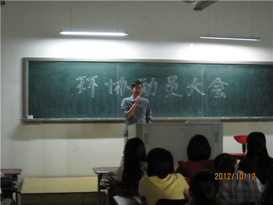 2012年10月12日,环境保护协会在主楼四#201开展了成员动员大会。出席本次大会的有环境保护协会的指导老师金亮,会长张燕燕,副会长潘恩智、凌婷婷以及各部门的部长和副部长们,还有此次大会的主角们——满怀激情的新成员。本次大会主要包括7个环节指导老师致辞、会长发言、部门介绍、游戏环节、自我展示、自由提问、申请说明。希望这些环节能为新成员在环境保护协会更好地发展自己的才能树立信心。