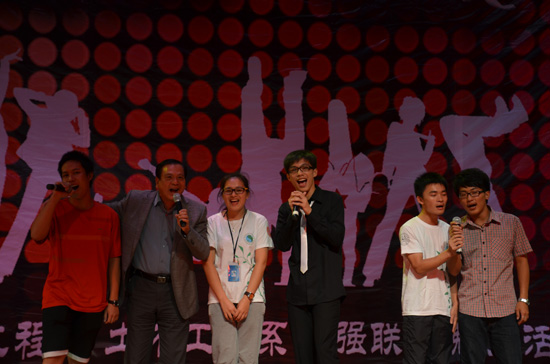 首先由土木工程系的系主任任胡华为大家演唱的《小白杨》,带动了全场的气氛,唱出了土木工程系的同学像小白杨那样的青春活力和坚强不屈。紧随其后的是环境科学与工程系的系主任卢昌义带来的一首闽南语歌曲《爱拼才会赢》。卢主任深情并茂的演绎赢得了阵阵掌声。同学们也按耐不住,自己冲上舞台和卢主任一起合唱。勇于拼搏,坚强不息!这是他们告诉同学们的人生哲理。