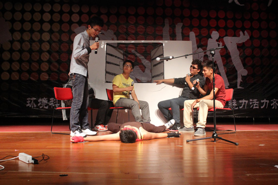 小品《公交车上》的表演者一上台便引发了观众们的爆笑。一名男演员反串为怀孕中的女人,一手扶着腰,一手娇柔地挽着“她”的丈夫,两人一副恩爱的样子……土木系的同学用他们滑稽生动的语言动作刻画出了公交车上发生的一件关于“关窗”的小事。用一种黑色幽默的表现形式讽刺了当代社会上的不良风气,蕴意无穷。