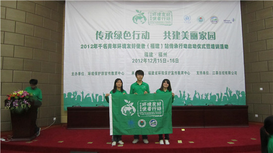 12月15-16日,环境保护协会会长张燕燕参加了2012年千名青年环境友好使者(福建站)传承行动启动仪式暨培训活动。来自省内5个城市、27所高校的青年环保志愿者用一天半的时间学习环保知识,并承诺以一传千,向公众传播生态文明意识。