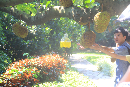 刘育梅博士首先给大家介绍了华侨引种园的发展历程及现状,随后带领大家参观了园内的热带果树区,南药圃和阴生植物区。在热带植物标本园里,有世界名树,桃花心木,铁力和柚木,有含油量高达20%的油梨,有贵重的工业原料紫胶的寄生树——苏门答腊合欢等,且全国仅有的两株大果红心木和胸径约1.5米的百年印度紫檀就种植在园内。在热带果树中,有金星果、蛋黄果、蛇皮果、文丁果、费约果、无籽番石榴、各种番荔枝。热带药用植物有泰国大凤子、阿拉伯胶、檀香、猫须草等。热带香料和饮料植物有香子兰、依兰、咖啡、可可等。参观之余同学们还饶有兴趣地品尝了园内的橄榄,黄皮,文丁果、爪哇凤果等热带水果。