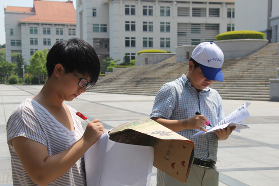 夏日的正午,焦阳当空,实践团队的领队老师周亮老师,带领团队的部分成员前往主楼前的区域进行植物挂牌踩点工作。为保证植物挂上的牌子的位置能一目了然,挂牌的植物的名称准确无误,周亮老师将植物的名称一一写在纸上,由成员们进行拍照。他们用绿丝带做为标记,以确认挂牌的树木,同时在校园的地图上标下需要挂牌树木的数量和位置。