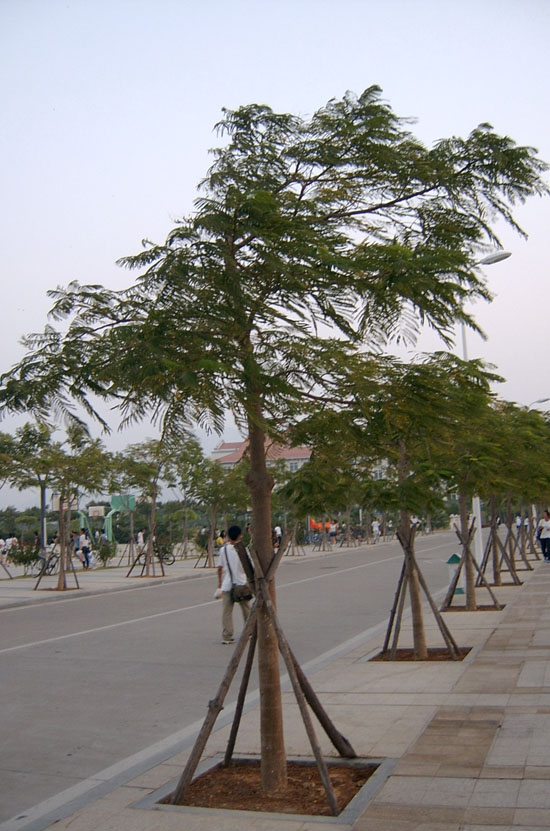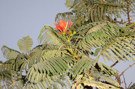 形态描述:落叶乔木,高达20米或更高。二回羽伏复叶长20-60厘米,羽片30-40个,每羽片有小叶40-80枚;小叶长椭圆形,长7-8毫米,宽2.5-3毫米,两端圆,上面绿色,下面淡绿色,两面疏生短柔毛。花排成顶生或腋生的总状花序;萼长约2.5-2.9厘米,基部合生成短筒1萼齿5,长椭圆形,先端骤急尖;花瓣红色,有黄及白色花斑,近圆形,有长爪,连爪长约3.5-5.5厘米,宽约3厘米;雄蕊10,分离,红色;子房近无柄,有多数胚珠。荚果条形,长可达50厘米,宽约5厘米,下垂,木质,具多数种子。