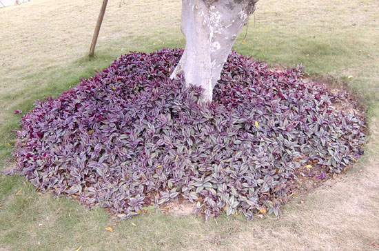 形态描述:茎稍柔弱,绿色,下垂,半肉质,分枝,节上生根;长圆形,披散或悬垂,长约1米,秃净或被疏毛。叶无柄;椭圆状卵形至矩圆形,长3~7厘米,宽1.5~3厘米,先端短尖,上面紫绿色而杂以银白色,中部边缘有紫色条纹,下面紫红色,鞘的顶部和基部或全部均被疏长毛。小花白色腋生。花团聚于一大一小的顶生的苞片状的叶内;萼片3,合生成一圆柱状的管,长约6毫米;花冠管白色,纤弱,长约1厘米,裂片3,玫瑰色,长约3毫米;雄蕊6;子房3室。果为蒴果。花期不定。