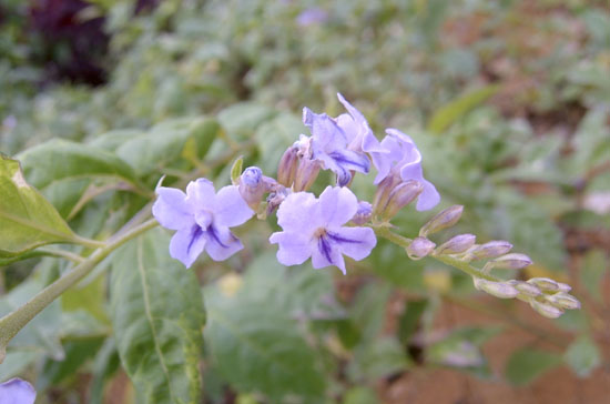 形态描述:常绿灌木或小乔木。株高1~3m,枝下垂或平展,茎四方,绿色至灰褐色。叶对生,卵状椭圆形或倒卵形,长2~6cm,中部以上有粗刺,纸质,绿色。总状花序排列成松散圆锥状,顶生;花小且通常着生在中轴的一侧,高脚碟状;花冠蓝紫色或白色;花期5~10月。核果肉质,卵形,金黄色,成串包在萼片内,有光泽。 叶对生,有黄色或白色斑,具短柄,叶片卵状椭圆形或倒卵形,有彩色斑纹,具锯齿。花冠淡紫色,总状花序顶生或腋生;果实熟时桔黄色。
