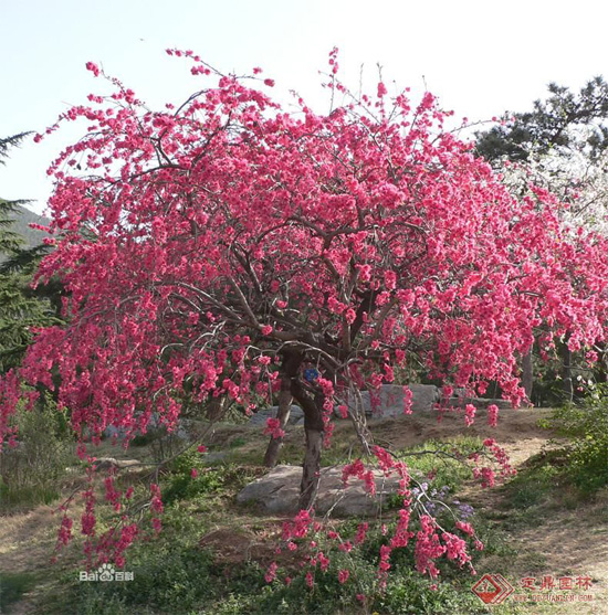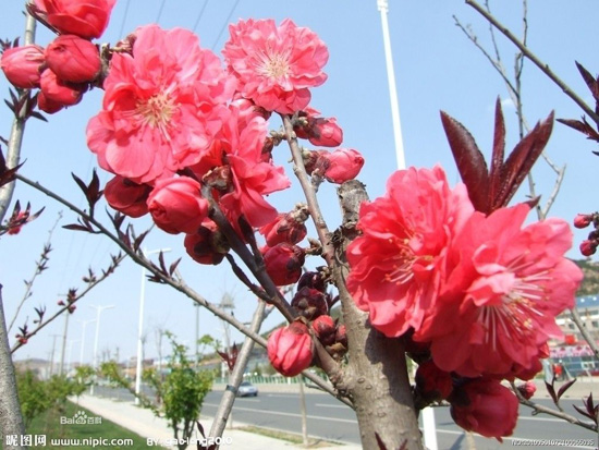 形态描述:为落叶小乔木。高可达8米,一般整形后控制在3米~4米,小枝红褐色,无毛;叶椭圆状披针形,长7厘米~15厘米,先端渐尖。花单生或两朵生于叶腋。属于观赏桃花类的重瓣品种统称为碧桃,都是果桃的变型;品种很多,如白碧桃、红碧桃、洒金碧桃、两色碧桃等。叶椭圆状披针形,先端长而尖,基部阔楔形,表面光滑无毛。叶缘具粗锯齿,叶缘具粗锯齿,叶基部有腺体。花芽腋生,先开花后展叶,花单生,花梗极短,原种之花粉红或白色,单瓣,栽培品种达40个以上。