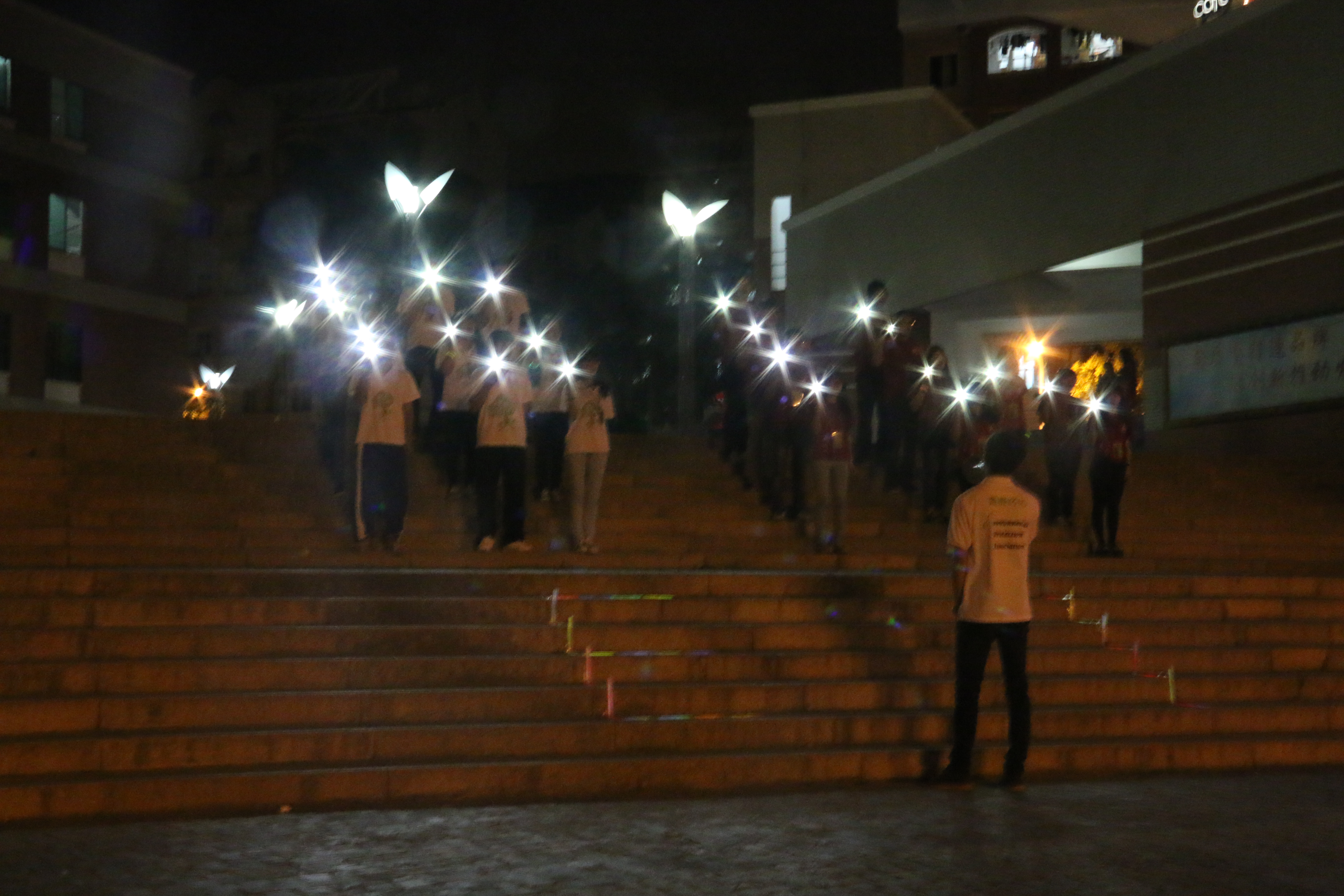 为了号召同学们熄灯,当晚8:30,志愿者们在广场的台阶上用荧光棒摆出“E 1 h”的字样,并有序地摆出“E 1 h”的倒计时队形,呼喊着“别让雾霾为你熄灯”口号。并进行每个园区的熄灯喊楼行动。园区内没有熄灯的同学们都被这阵热血沸腾的呼声感染了,纷纷自觉关上了宿舍的灯。