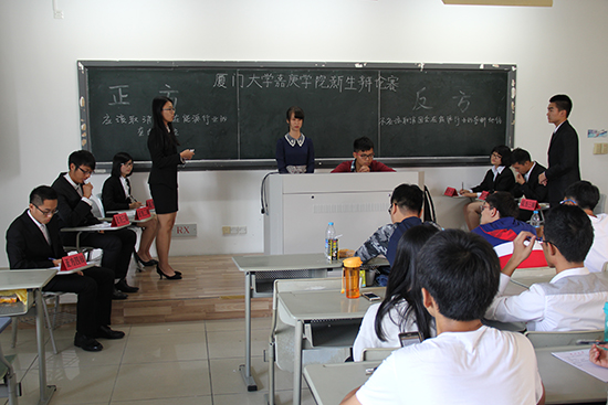 2014年11月11日中午13:00在公一#213展开了第八届嘉庚学院新生辩论赛首天即环境科学与工程系全院新生辩论赛第一场的较量。辩论双方为会计系组成的正方和环境科学与工程系组成的反方,正方立场为应该取消国企在能源行业的垄断地位,反方立场为不应该取消国企在能源行业的垄断地位。
