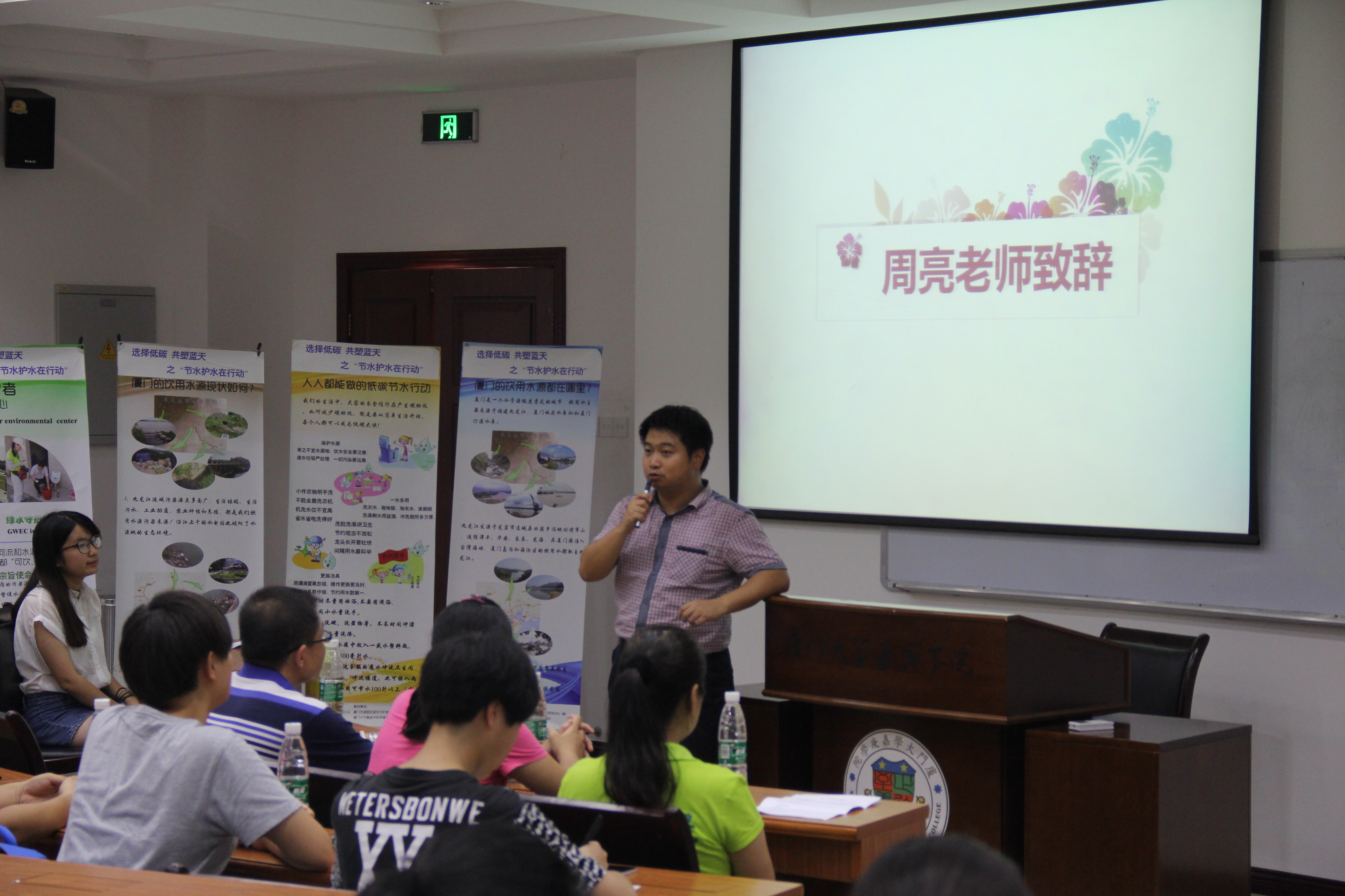 活动伊始,主持人孙川惠介绍了活动主题“选择低碳,共塑蓝天之‘节水护水在行动’”,以及成�正荣微公益资助的情况。接着环境科学与工程系系主任助理周亮老师致辞,并介绍了参会的厦门绿拾字、绿水守护者等环保NGO组织,并号召同学们以NGO组织为学习模板,踊跃开拓有创意、能落实的环保公益项目,延续环科系在2015年“创青春”公益创业赛获国赛铜奖的优异成绩。