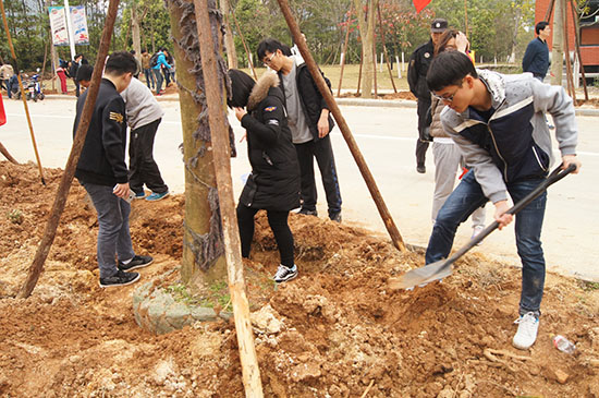 当天早上9点,全院的领导及教职工,以及140多名来自10个院系的同学在公共教学楼一号楼前集合,队伍浩浩荡荡,气势磅礴,充满了朝气。主持人宣布植树节活动正式启动,周亮老师为大家讲解如何种树。