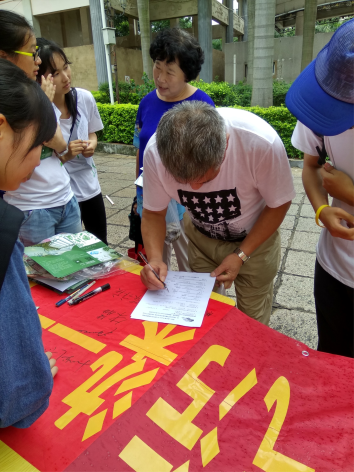 由于天气问题,宣传活动在13时被迫终止了,但是大家还是收获了许多经验。我们在收好满满一叠填好了的问卷调查表和一道签有许多姓名的横幅后,与小区负责人员合影留念。Super Air室内空气检测团队第一次厦门宣传活动便就此圆满结束。