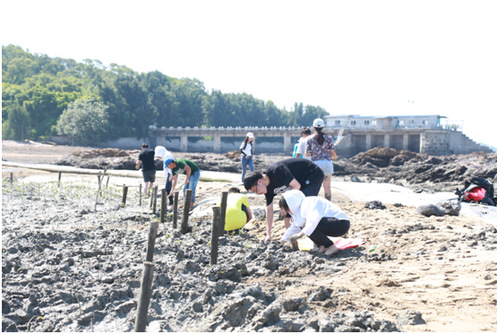 上午8时,同学们在两位老师的带领下集合,享受了一阵骄阳与海水后,一起踏上了大屿岛,见到了已具有一定规模的红树林,并积极参与新红树林的种植。“我们经常在这样的地方呆4个小时,有时候会在那里呆24小时。”金亮老师指着茂密的红树林说道。