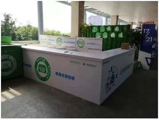 当天,与会代表在厦门参观了快递绿色包装全新的试点示范。集美大学驿站作为中华环境保护基金会菜鸟绿色联盟公益基金在厦门打造的纸箱和塑料分类回收的示范站,回收箱、工作台是用废弃塑料、木材重新循环利用制成的,在这里,绿色回收专区放置了纸箱、塑料和填充物三类快递废弃物分类回收的不同回收箱,标识清晰引导师生实现快递包装的循环利用。