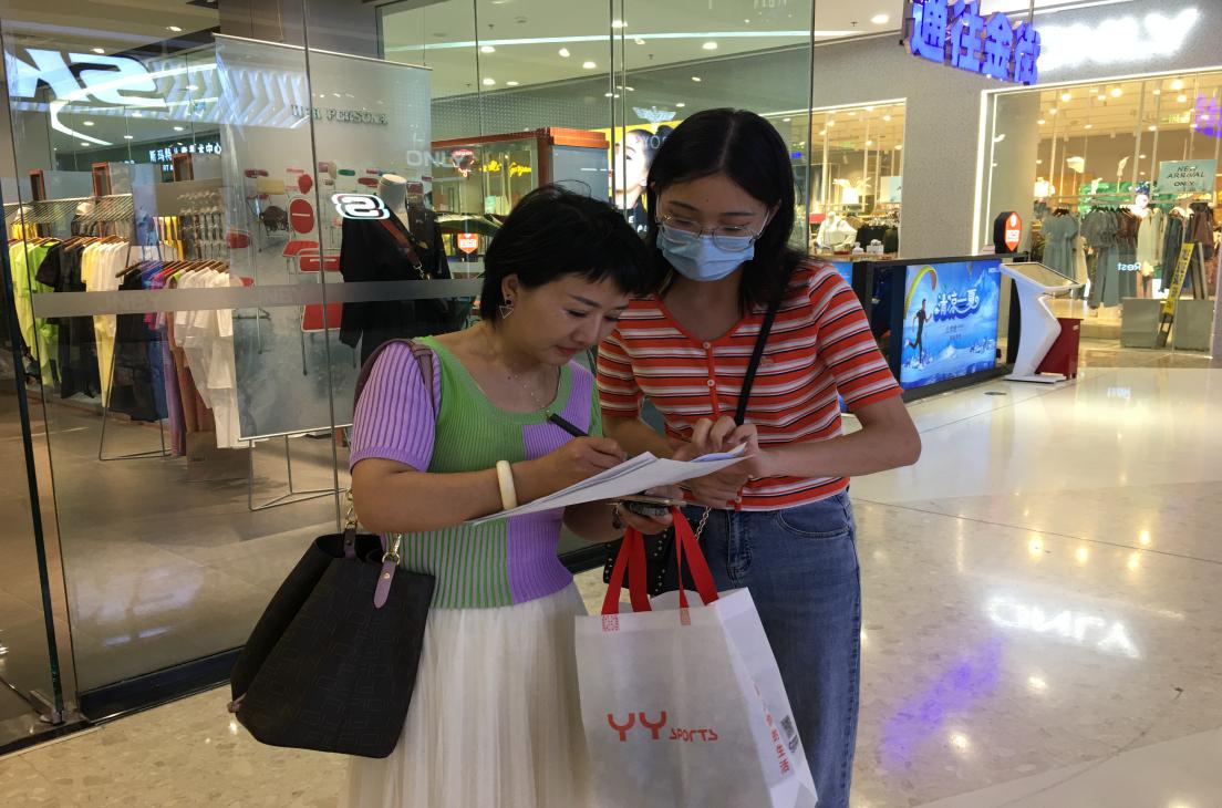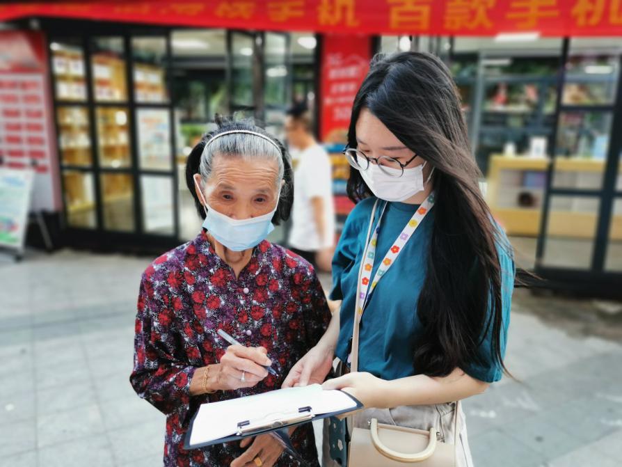 SUN’s mask团队陈潇怡在陕西省西安市街头与行人沟通交流