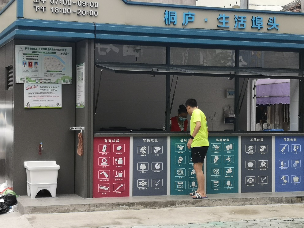 2020年8月6日,我们来到杭州市桐庐县的开元街老城社区做巡街志愿者。早上七点钟垃圾分类箱旁边就堆满了垃圾。(垃圾箱房定点开放,早上七点至九点,晚上六点至八点)通过询问了这个点的志愿者得知,这里的居民还没有完全适应定点投放,很多人早上七点前就出门上班了,或者晚上九点十点才回家想着倒垃圾,并且还有很多人始终没有分类的意识。
