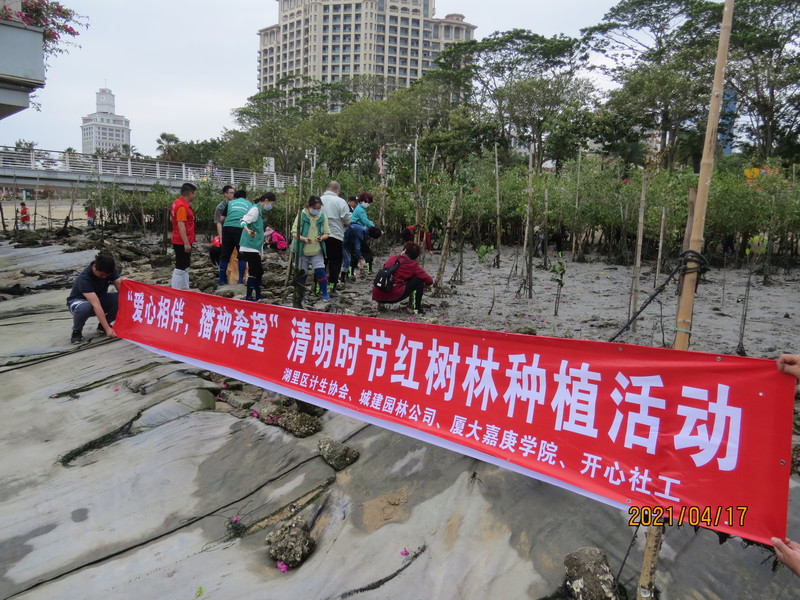 为帮助失独家庭父母寄托和表达对孩子的思念,缓解哀伤情绪,我院联合湖里区计生协会、海沧城建公司于4月17日上午在海沧大道未来海岸亲水栈桥协同开展了“爱心相伴,播种希望”特殊家庭红树林种植活动。湖里区计生协会工作人员、失独家庭父母、城建园林党团员代表、环境科学与工程学院党团员,约四十人参加了此次活动。河口生态安全与环境健康福建省高校重点实验室(厦门大学嘉庚学院)作为本次活动的技术指导单位。