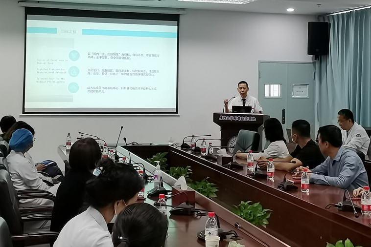 内科第一党支部书记王威开展了关于翔安医院发展建设的微党课。他系统地介绍了翔安医院的建设历程、科室设置、人员情况、信息化建设等方面的情况,特别说明了翔安医院在器官移植等方面的临床工作取得的亮点成绩。经过两年的发展,厦门大学附属翔安医院的科室建设逐渐完善,诊疗设备基本完善,门诊、急诊以及住院全面开放。翔安医院以“国内一流,国际知名”为建设发展目标,攀世界医学高峰,创全国百强医院。