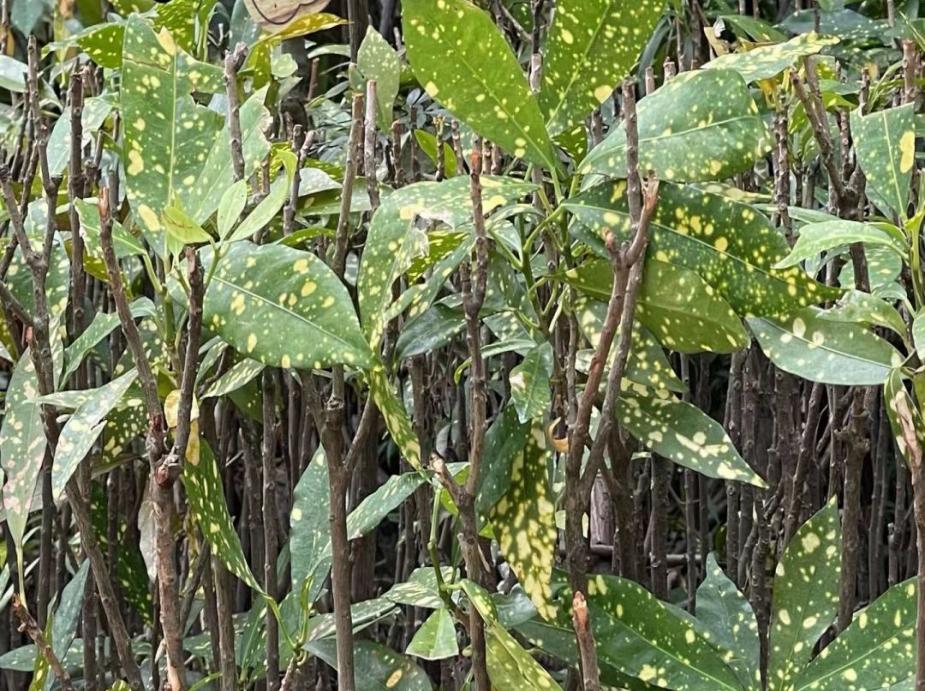 花叶青木(Aucuba japonica)是山茱萸科,桃叶珊瑚属青木的变种,常绿灌木,植株高可达1.5米;小枝对生。叶革质,叶片卵状椭圆形或长圆状椭圆形,叶面光亮,具黄色斑纹,叶柄腹部具沟,无毛。圆锥花序顶生;雌花序为短圆锥花序;花瓣紫红色或暗紫色,雄花花萼杯状,雌花子房疏被柔毛,柱头偏斜;浆果长卵圆形,成熟时暗紫色或黑色,花期3-4月;果期至翌年4月。