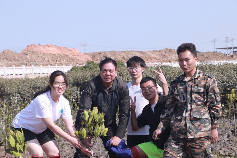 “要留出‘林窗’,让树苗更好生长”“注意保护好树苗的根”……尽管卢昌义院长年事已高,他仍然与年轻人一起摸爬滚打在第一线。随着卢院长的劳作讲解示范,师生们撸起袖子、迈入滩涂、挖坑扶树、培紧踩实,每个环节有条不紊,通力合作、相互配合,呈现出一派热火朝天的劳动景象。师生们共同植下了7000株白骨壤、80株红海榄和80株秋茄红树林苗。