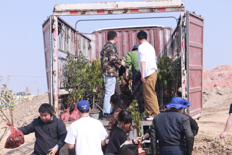 师生们个个干劲十足,一株株树苗从运苗车上卸下,在大家手中有序传递,一片繁忙景象,形成了一道亮丽的风景线。