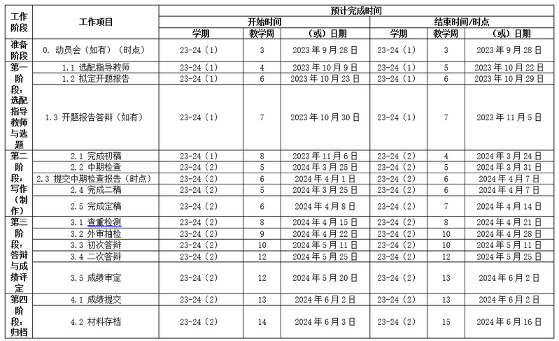 我院于第4周已完成定题并公示,现已正式进入2024届毕业论文(设计)工作,请各位指导教师有序按照如下工作计划表指导学生开展毕业论文(设计)工作,具体参照附件:2024届毕业论文(设计)相关附件。