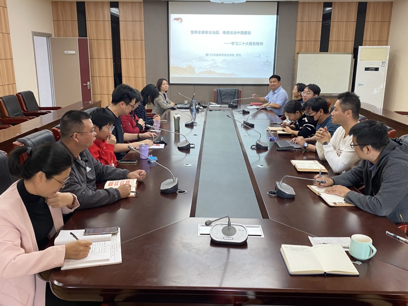 2023年11月29日,环境科学与工程学院教工党支部有幸邀请到嘉庚学院党的二十大精神宣讲团成员、厦门大学国际法专业博士、法学院党总支罗芳书记为我院教工党员开展党课,环境学院党总支书记周亮老师主持会议,教工党支部14名党员参加本次学习。