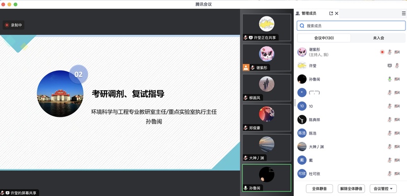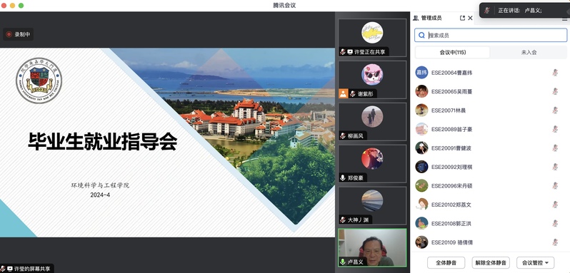 2024年4月10日19:30,环境科学与工程学院于线上举行毕业生就业指导会,环境科学与工程学院院长卢昌义,学院党总支书记、院长助理周亮老师,副院长廖颖敏老师,环境科学与工程专业主任孙鲁闽老师,给排水工程专业主任黄金阳老师,资源环境科学专业主任王鸿辉老师,部分往届优秀校友,2024届毕业生及部分其他年级学生参会,本次会议由环境科学与工程学院团委书记、辅导员郑俊豪老师主持。