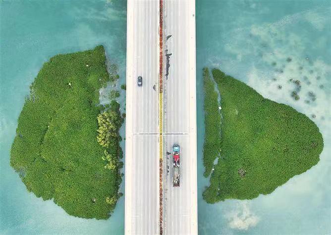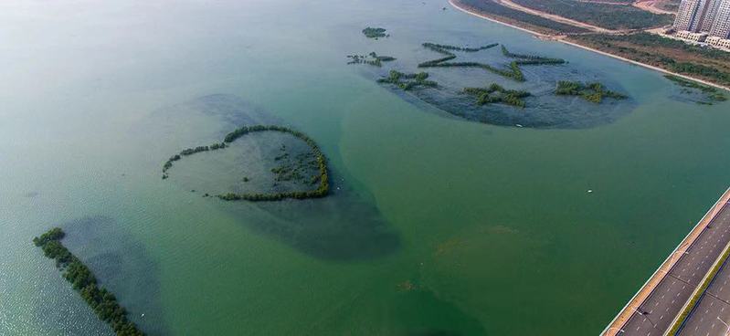 从空中俯瞰厦门下潭尾红树林湿地公园,由红树林组成的“I”“爱心”和“五星”的图案在海面上铺展,形成了“我爱中国”的壮丽景观。此处已成为厦门市的新地标,每天吸引无数游人徜徉流连,也受到央视、新华社等多家主流媒体报道。这幅红树林绘就的画作正是出自卢昌义教授的手笔。