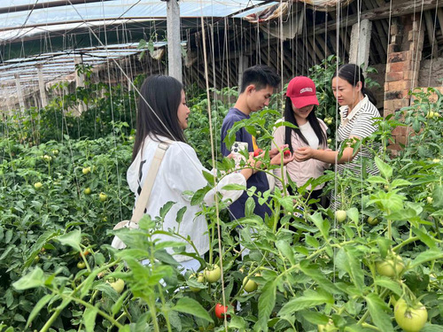 实践队员正在学习与观察大棚种植果蔬