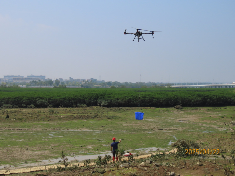 无人机运输P150无人机搭配运输系统,现场将本次种植的部分苗木安全运至滩涂。展示突显了无人机在红树林种植与维护中的巨大潜力,实现远距离运输的目的,并减少过程中的苗木损耗。