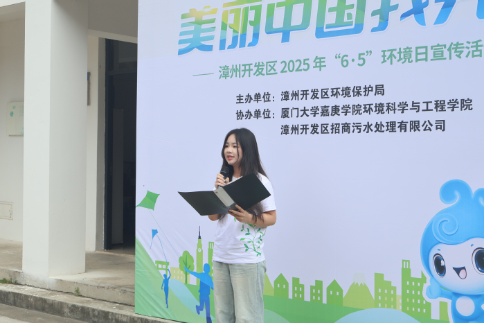活动在主持人杨曙东的精彩开场中拉开帷幕,他不仅介绍了到场嘉宾,还深情讲述了世界环境日的由来,唤起了大家对环境保护的深刻共鸣。随后,厦门大学嘉庚学院2023级资源环境科学专业学子任佳敏作为学生代表发言,她以“美丽中国我先行,绿色发展青年为”为主题,致敬习近平总书记的生态文明思想,并代表青年一代发出庄严倡议:“从节约一滴水、一度电做起,从践行垃圾分类、低碳出行发力,以点滴行动汇聚生态保护的磅礴力量。”